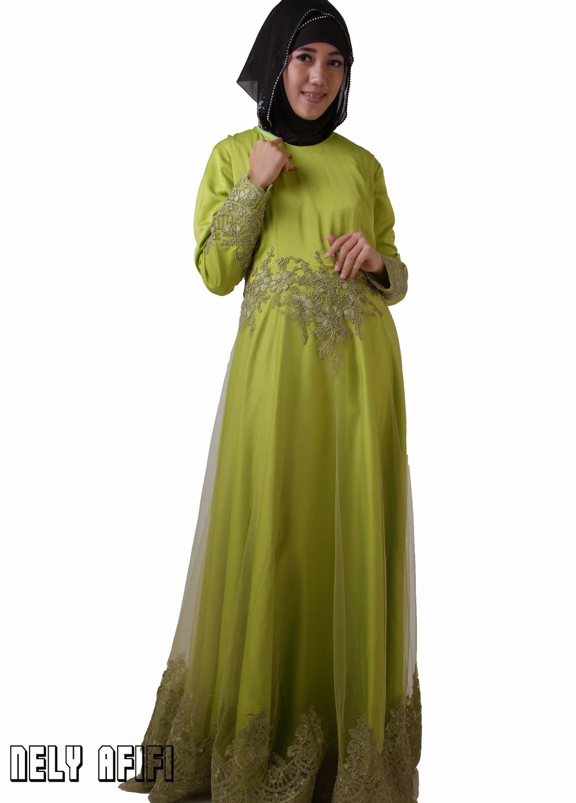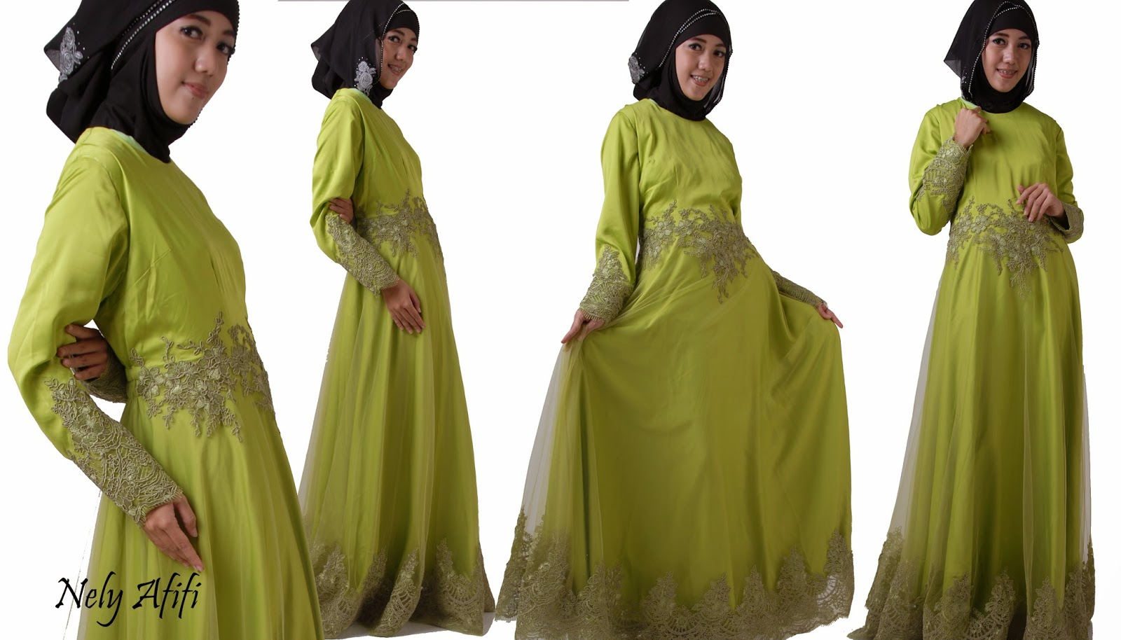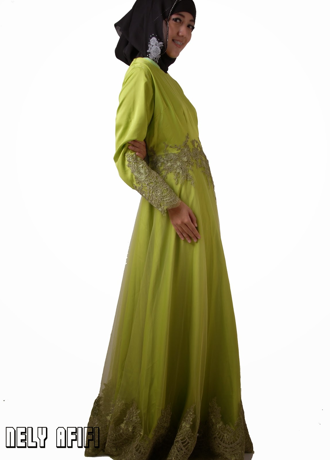 | Gamis Pesta Muslimah dari Bahan Tile Brocade Hijau |